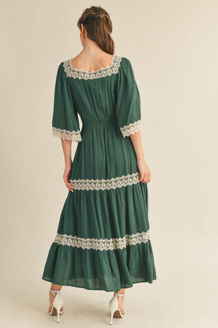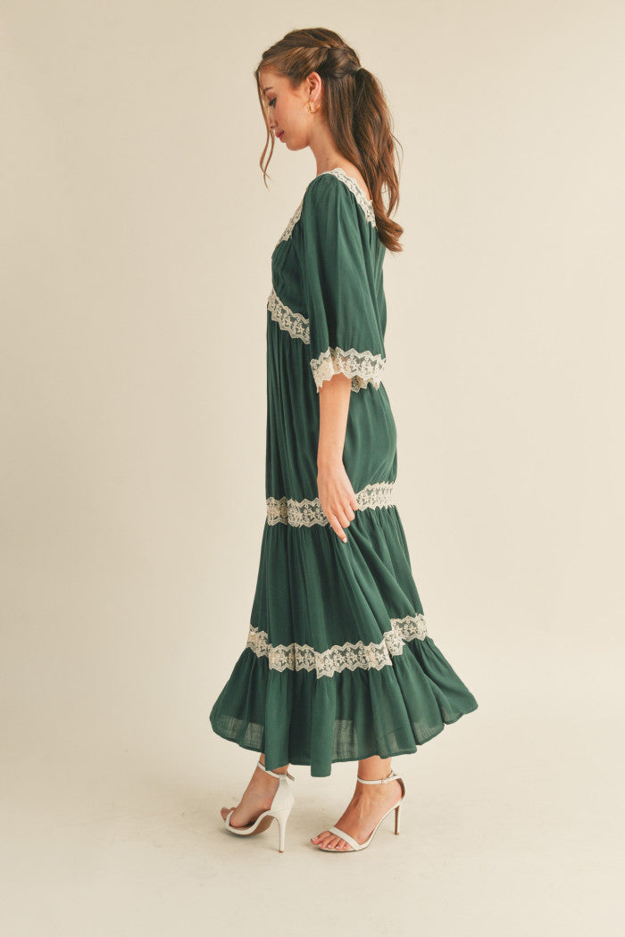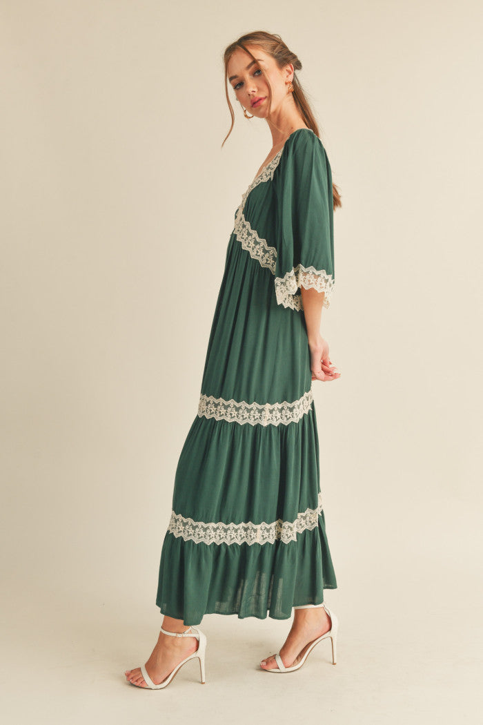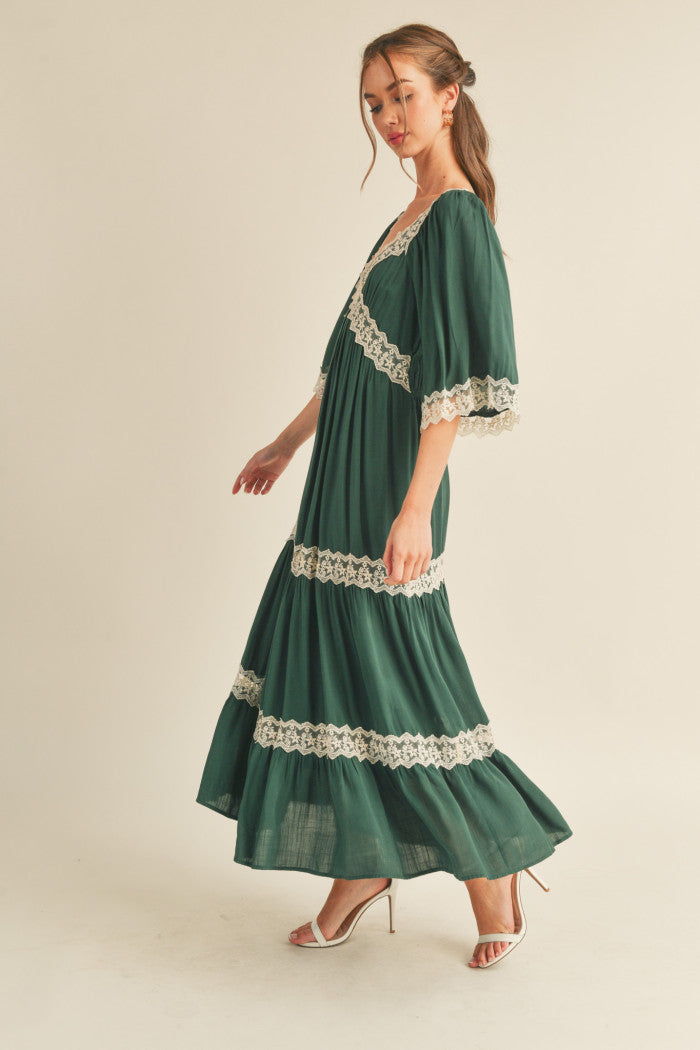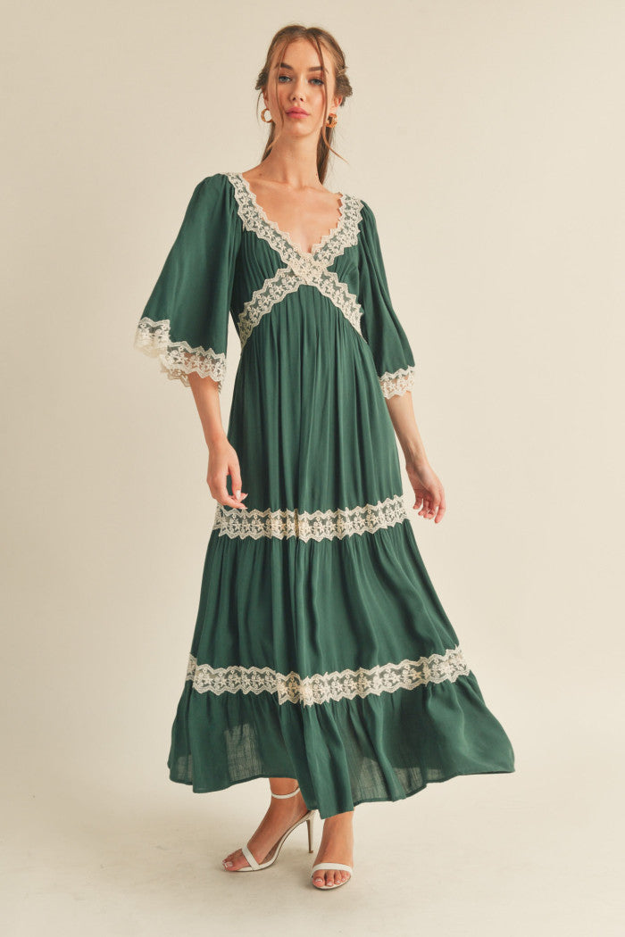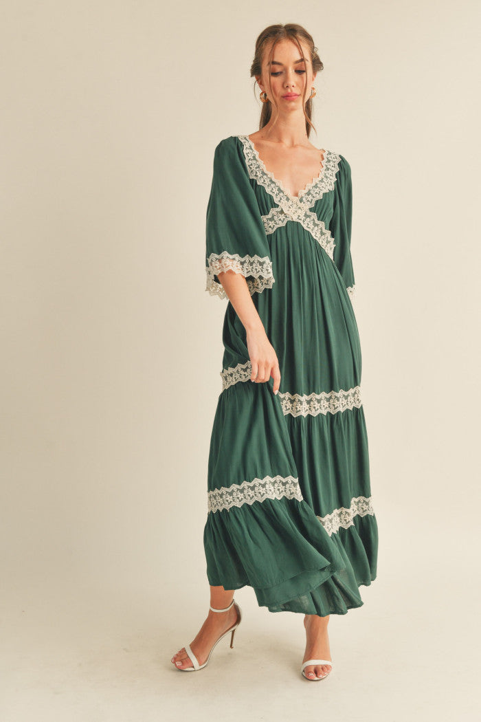 This dress features a sophisticated crisscross neckline and a flowing silhouette. It is designed with elegant 3/4 drop sleeves, delicate lace trim accents, and a tiered maxi length for a graceful finish.