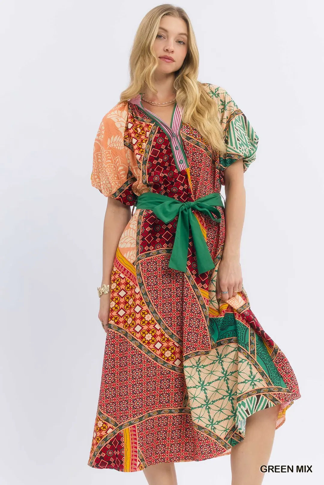 Embrace your inner garden wanderer in this charming midi dress that celebrates color and pattern. The playful patchwork print brings visual interest, while the self-tie sash belt lets you cinch the waist exactly how you like it. A flattering V-neckline features a striped contrast placket for extra personality, and the A-line silhouette skims beautifully to midi length. Unlined for breathable comfort on warm days.