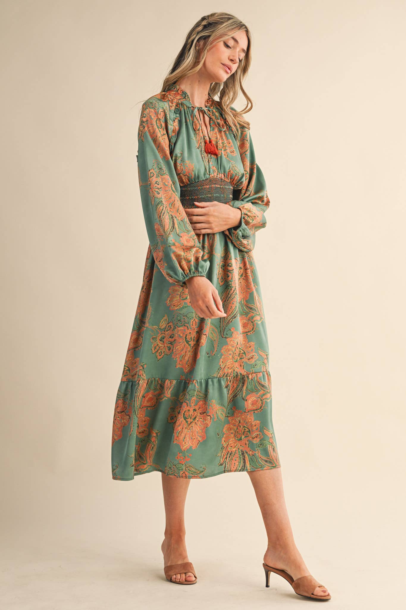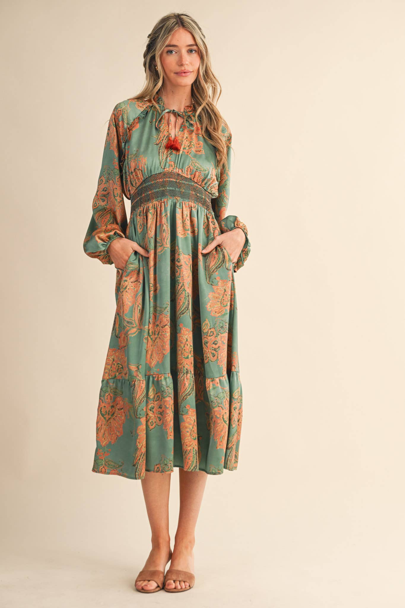 Elevate your wardrobe with this paisley print midi dress featuring a smocked elastic waistband for a flattering fit. The ruffled neckline includes a notched V and delicate tassel ties that add subtle charm. Long puff sleeves gather at elastic cuffs, complemented by ruffle-trimmed raglan seams. Finished with a flowing ruffle midi hem, practical pockets, and a lined interior for comfort and ease.