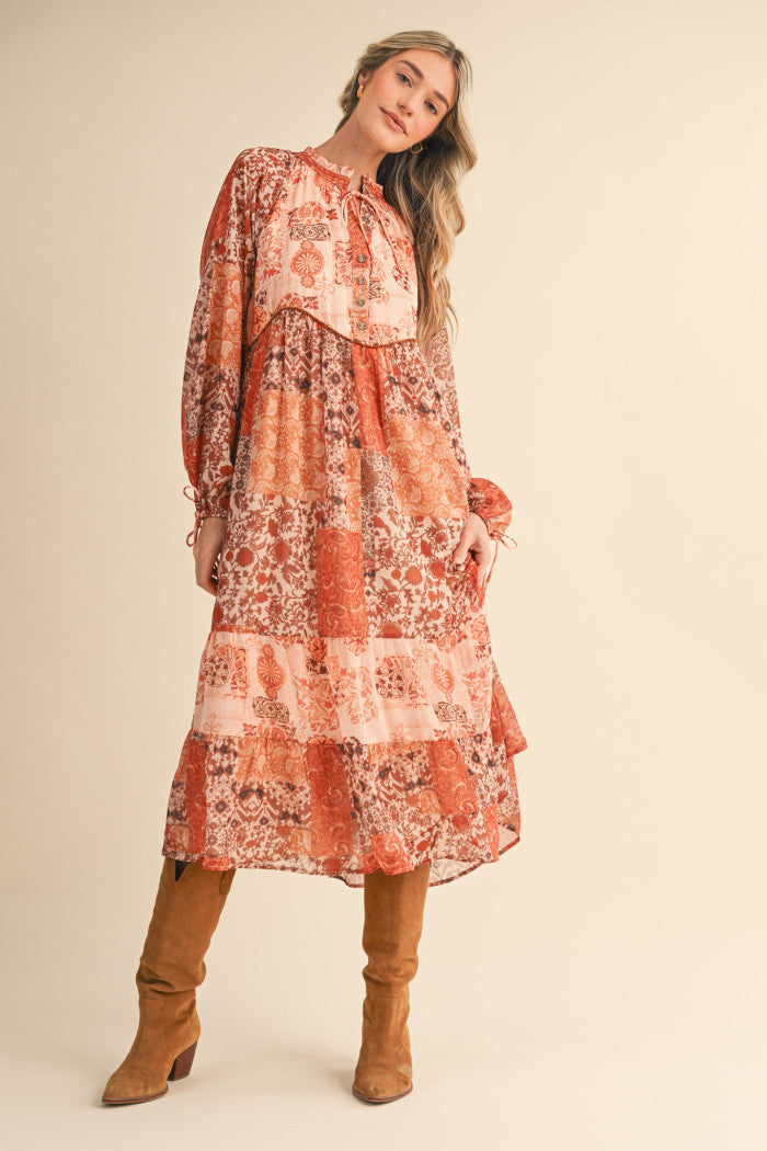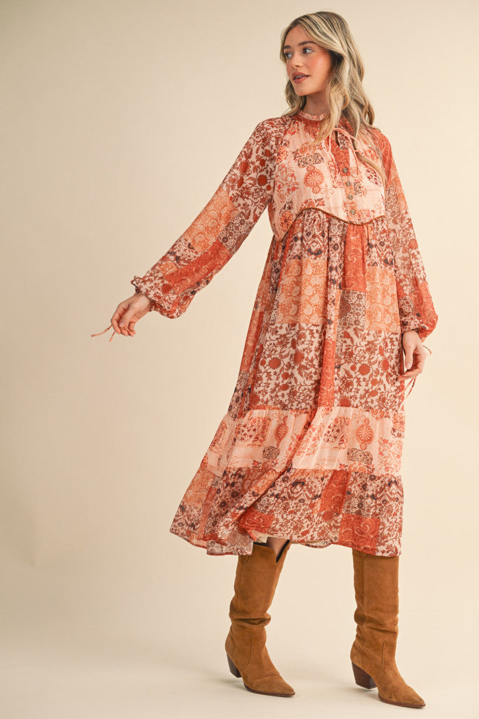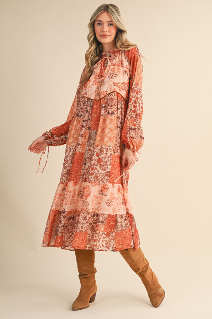 Elevate your style with this patchwork print midi dress, crafted from woven fabric for a refined finish. Features include long puff sleeves with tying cuffs, a ruffled notched V neckline, and a half-button placket for subtle elegance. The contrasting velvet piping defines the waist, leading to a tiered seam skirt with convenient pockets. Fully lined for comfort, this dress combines sophistication and charm in one effortlessly graceful piece.